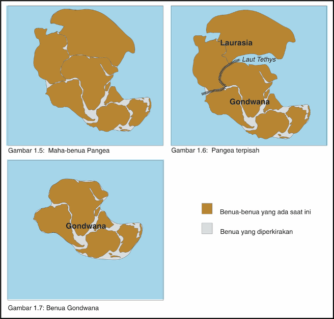 Gondwana mengapung ke arah selatan sedangkan Laurasia mengapung ke arah utara. Australia, India, Antartika, Irian Jaya, dan bagian-bagian Pulau Sulawesi merupakan bagian dari Gondwana. Diagram dalam Gambar 1.6 menunjukkan pecahnya Pangaea menjadi Laurasia dan daratan Gondwana. Dalam Gambar 1.7 daratan Gondwana tampak sebagai suatumahabenua yang terpisah.