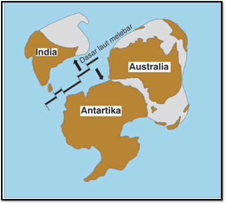 Kira-kira 100 juta tahun yang lalu, India terpisah dengan Antartika. Hal ini tampak dalam Gambar 1.11.