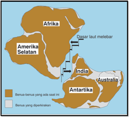Kira-kira 150 juta tahun yang lalu benua besar Gondwana mulai terpecah. Pertama-tama, Afrika dan Amerika selatan terpisah dengan India, Antartika dan Australia. Hal ini tampak dalam Gambar 1.10.