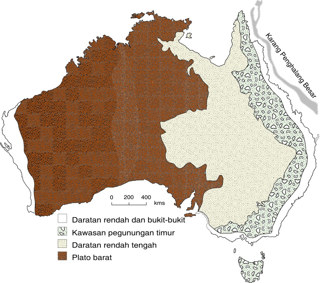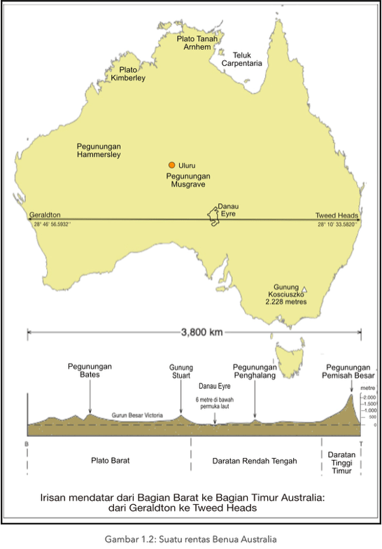 Kawasan bentang alam Australia dapat dilihat pada Gambar 1.1. Gambaran lebih jauh tentang bentang alam Australia dapat dilihat dalam rentas benua yang mulai Geraldton di bagian barat ke Tweed Heads di bagian timur. Rentas tersebut dapat dilihat dalam– Gambar 1.2.